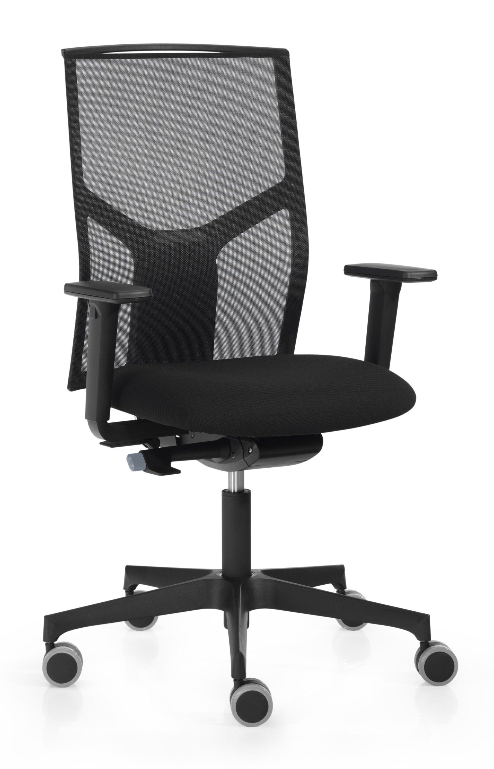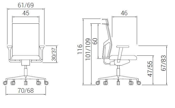 Regulable en altura con lama de acero bitubo con acabado en negro o con cromado de 12 a 15 micras de grosor, según base.Estructura de respaldo en inyección plástica de nylon color negro, reforzado con 30% de fibra. Respaldo en malla técnica de alta resistencia.