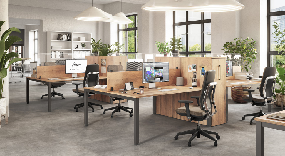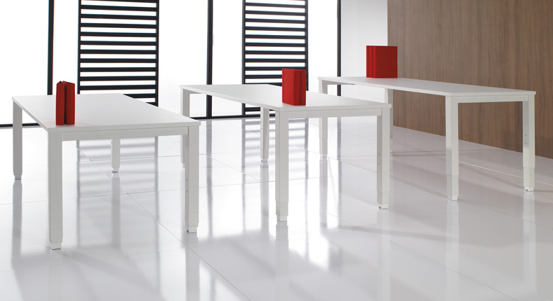 Colección de mesas de oficina para instalaciones con estructura metálica.