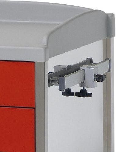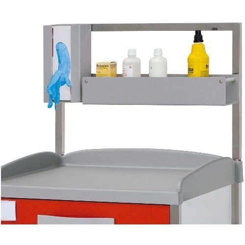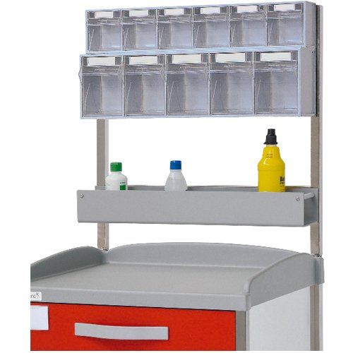 Carro medicación con 4 cajones con auto-cierre y 2 bandejas con 8 cajetines para medicación.