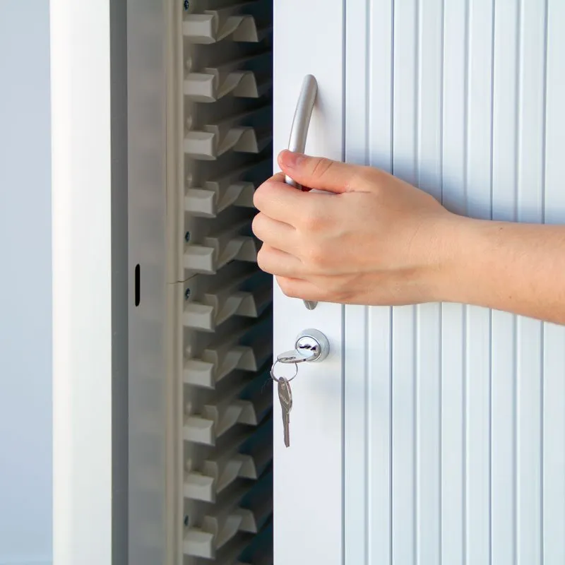 Su puerta persiana con apertura lateral evitando las lesiones propias del uso del producto, pues no hace falta que el personal sanitario se agache.