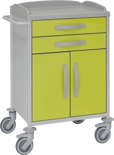 Carro multifunción con dos cajones superiores y dos puertas abatibles inferiores con interior diáfano.
