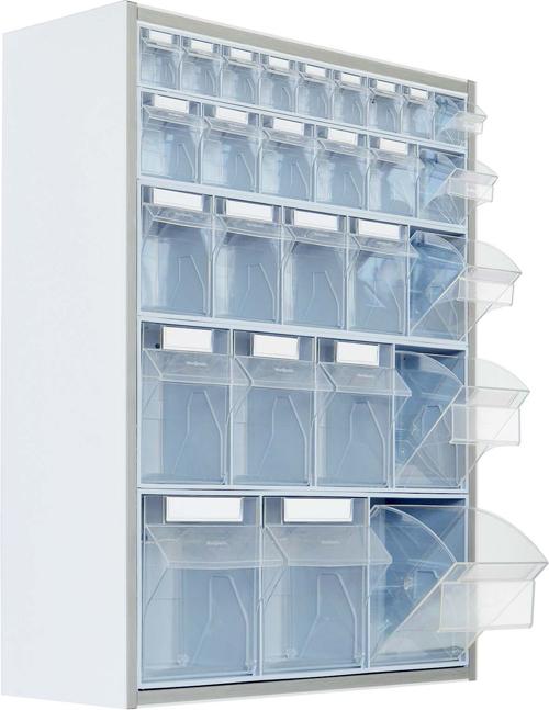Cajas basculantes transparentes equipadas con espacio para tarjeta identificada.Dimensiones: 65x20x80(alt) cm